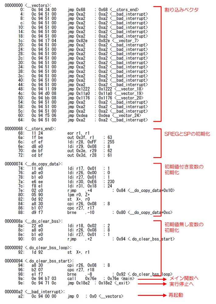 リセット後、0x0000番地にあるJMP命令、この例ではJMP 0x0068(JMP __ctors_end)から実行開始します。