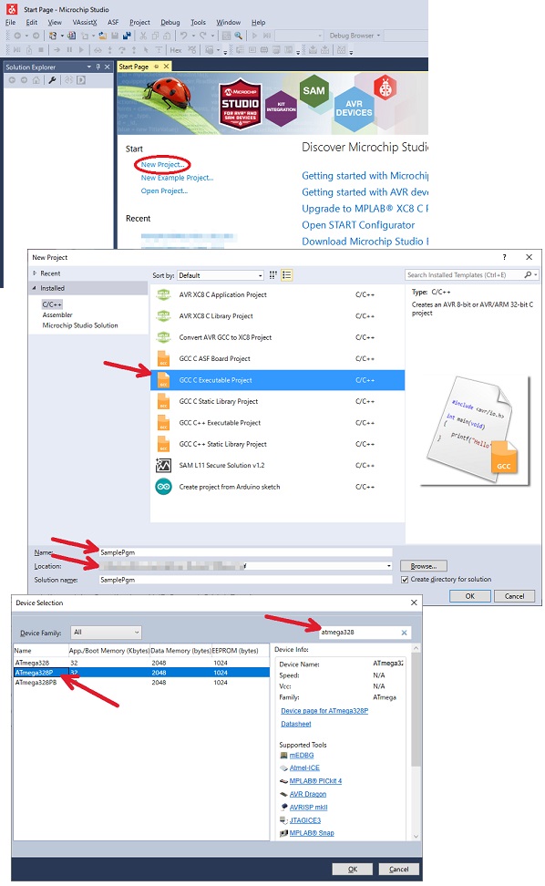 まず、MicrochipStudioを起動して、下図の例のように新プロジェクトを作成します。