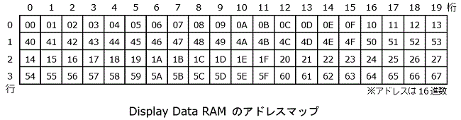 DDRAMは20桁×4行分あり、そのアドレス配置は下表のようになっています。表にあるように、アドレスを+1していっても、1行目の行末から2行目にはつながらないので注意が必要です。